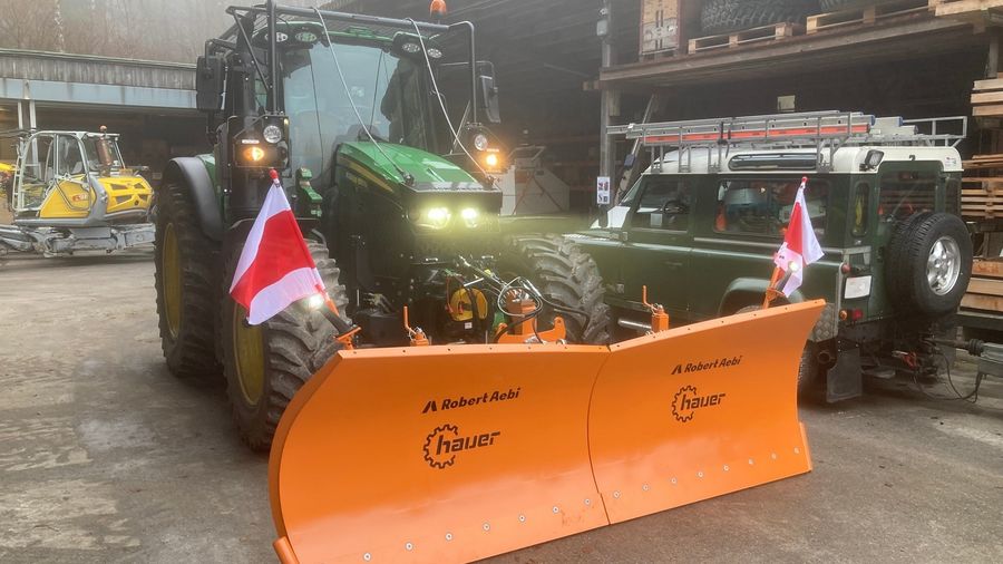 Neumaschinenablieferung 01.11.2024: Traktor John Deere 6120M mit Schneepflug Zaugg G32-300-2 und Salzstreuer Rauch Axeo 18.1. Mehr